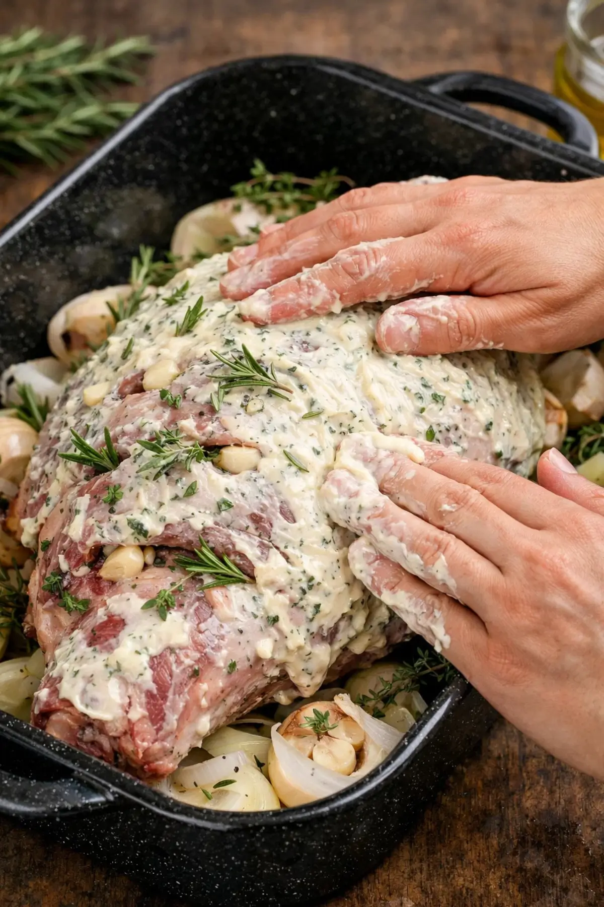 - Fresh rosemary – Woodsy, aromatic, and essential for that classic lamb pairing. You’ll use both sprigs and bits tucked inside the meat.